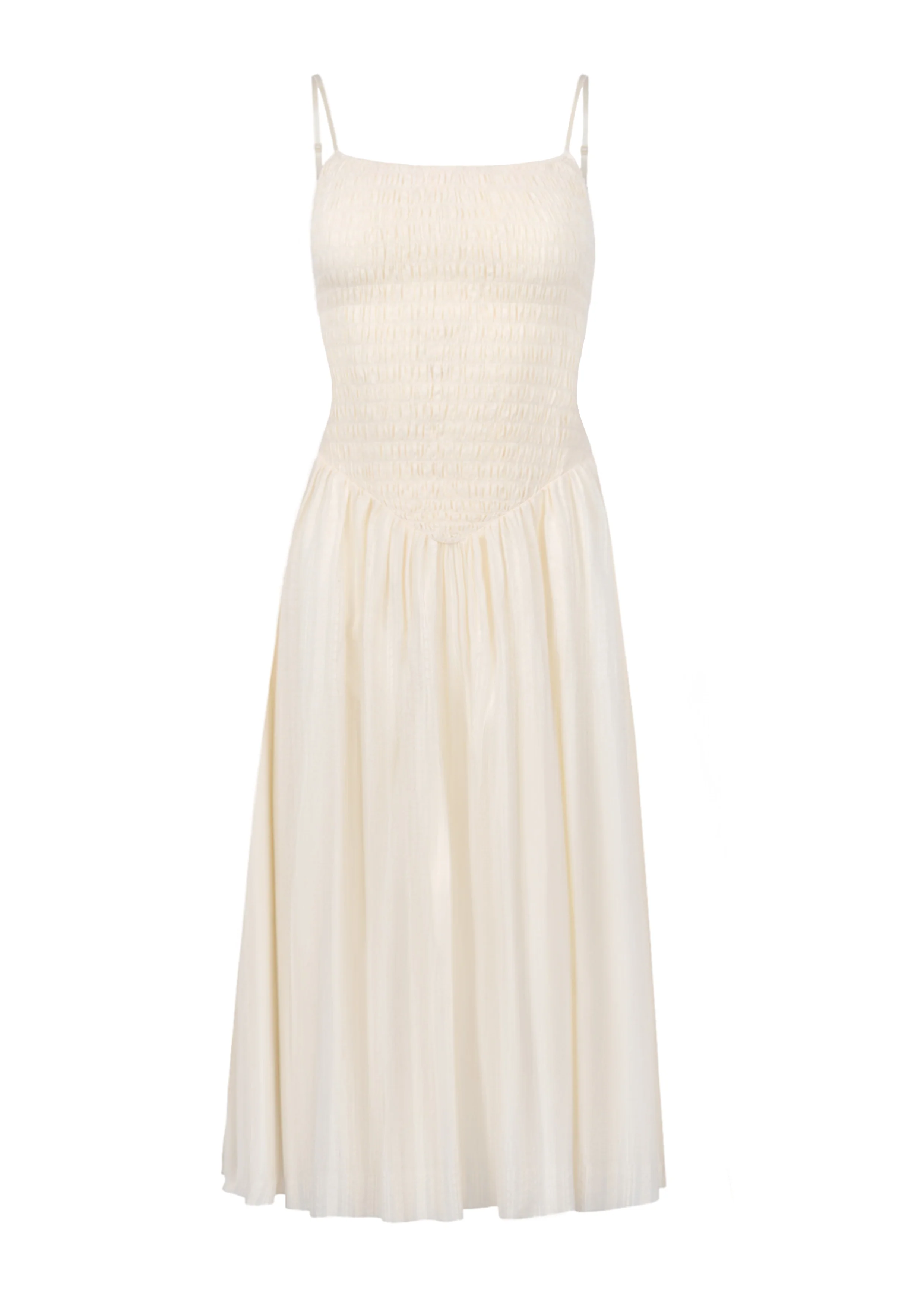 A ruched stretchy midi dress with a dropped waist panel and full skirt.
