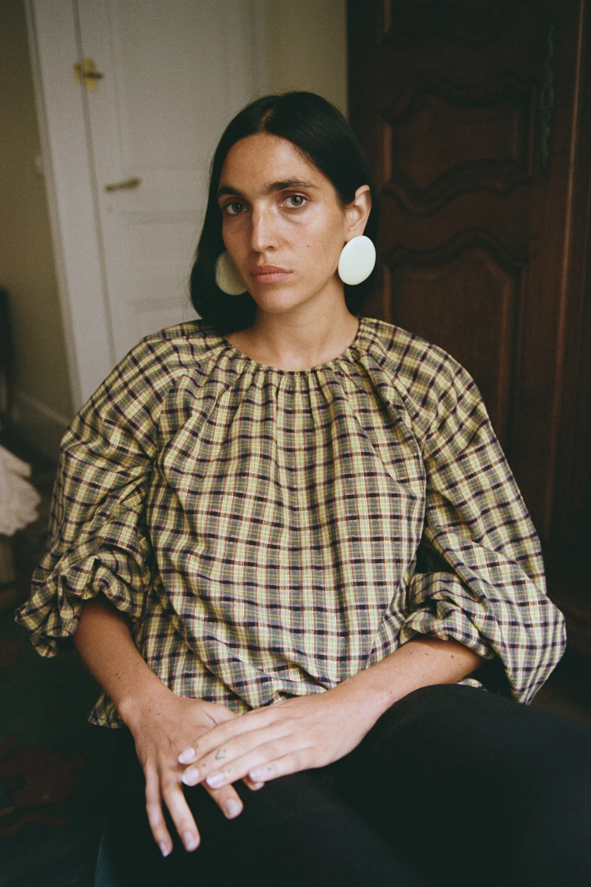 Made from a midweight cotton plaid fabric with lurex thread woven throughout.